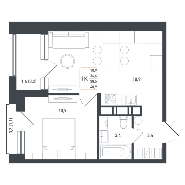 1-комнатная квартира 40,8 м²