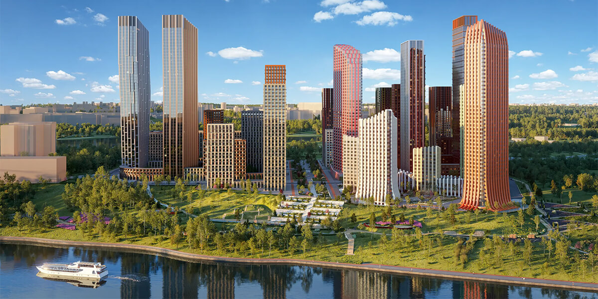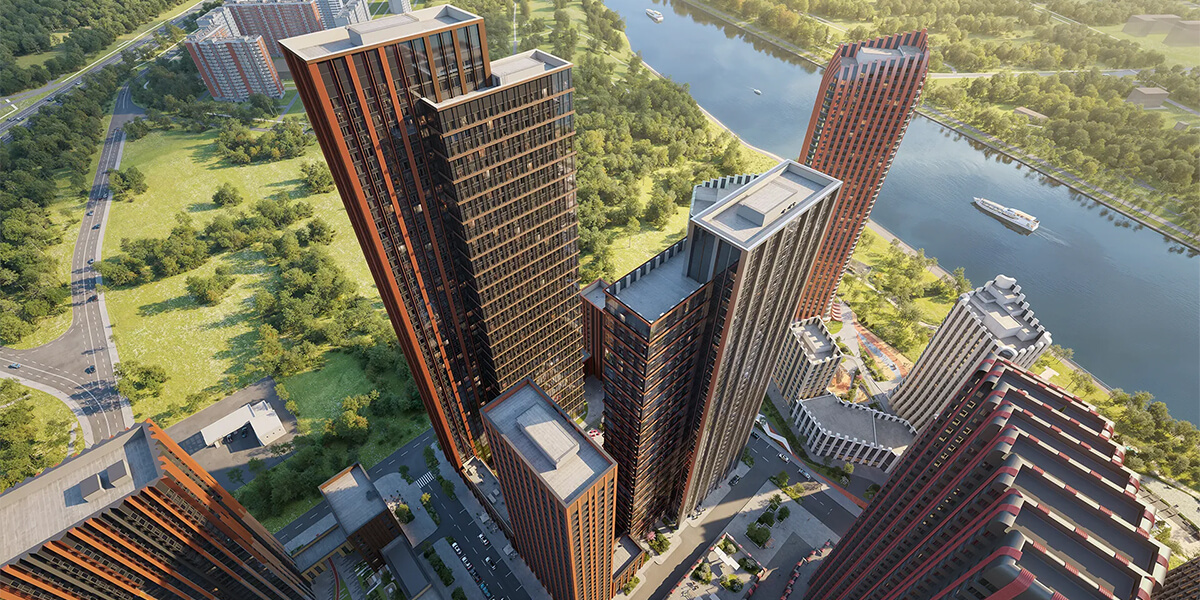 52-этажная доминанта и три корпуса поменьше - 40, 24 и 14 этажей - получили имена, отсылающие к морской стихии: "Азур", "Бонди", "Индиго" и "Сапфир". Проект фасадов разработало архитектурное бюро "СПИЧ". Вместо типового решения - индивидуальный подход: единая отделка стеклом и алюминием, но у каждого здания своя цветовая палитра. Панорамное остекление открывает резидентам перспективу на Москву-реку, акваторию Борисовских прудов и парковые массивы.