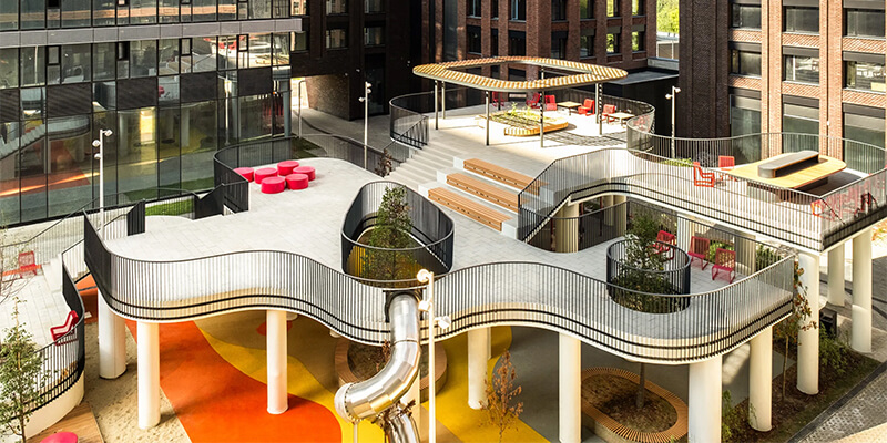 Внутренний двор жилого комплекса полностью изолирован от транспорта. Пространство разделено на два уровня: нижний ярус отвели под детские игровые городки, верхний - под зоны отдыха для взрослых. На всей территории работает беспроводной интернет, а в скамейки встроены зарядные станции для гаджетов.